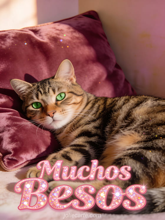 Envía un cariñoso saludo de muchos besos a alguien querido con esta encantadora tarjeta. Un gato atigrado de ojos verdes descansa sobre un cojín de terciopelo burdeos, bañado en cálida luz de tarde. Descubre también una tarjeta de super besos o una tarjeta de besos lindos.