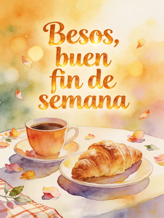 Compartan un saludo acogedor de fin de semana con letras de brillo miel, una taza de café caliente, un croissant, pétalos y una mesa colorida de desayuno. Descubran también besos último fin de semana del año, imágenes besos feliz fin de semana o besos imágenes bonitas feliz fin de semana.