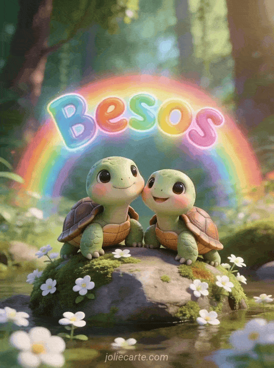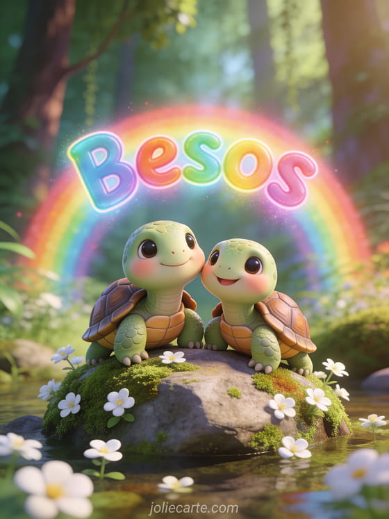 Envía dulces besos con esta tarjeta gratis de clipart con una adorable pareja de tortugas lindas lado a lado en una roca musgosa con suave luz del bosque. Descubre también una tarjeta besos y café imagen o una tarjeta enviar besos.