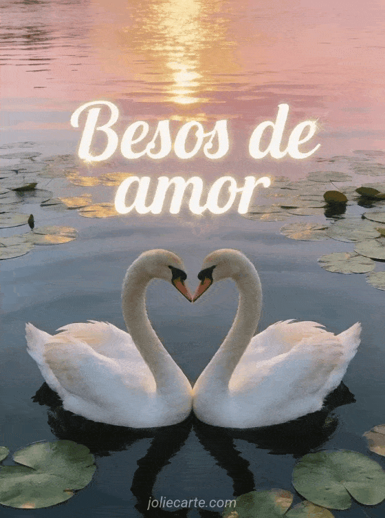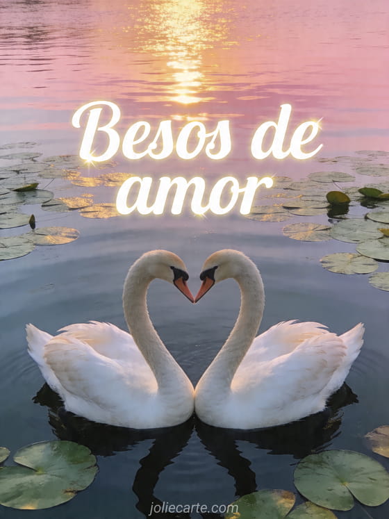 Comparta un romántico mensaje de besos de amor con esta elegante tarjeta de dos cisnes formando un corazón con sus cuellos sobre un lago brillante. También puede descubrir imagen besos, besos gif o logos animados besos.
