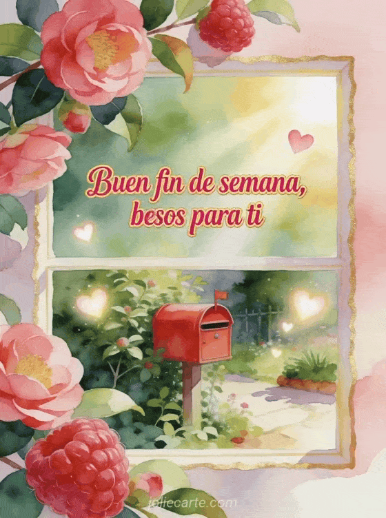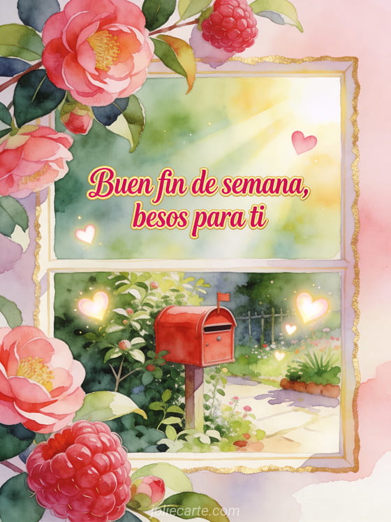 Envía un saludo dulce de fin de semana con letras color frambuesa, camelias, un buzón rojo, corazones luminosos y suaves rayos de sol. Descubre también una feliz fin de semana besotes imagen, un buen fin de semana divertido humor o una buen fin de semana naturaleza.