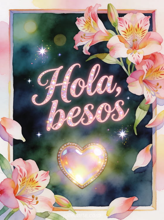 Envía un hola tierno con besos en letras rosa brillante, brillo delicado, flores de alstroemeria, pétalos sueltos, un adorno de corazón pulido, luz pastel y acentos de estrellas brillantes. También pueden compartir hola besos a todos, hola clipart o un besito de paso.