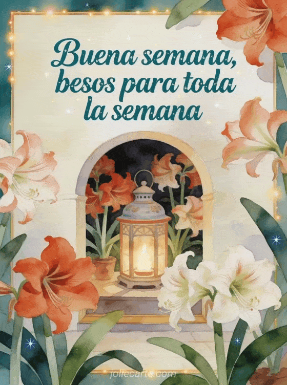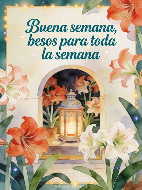 Compartan un saludo cálido de buena semana con letras verde azulado profundo, una linterna de cerámica, un arco acogedor y flores abundantes de amarilis. Descubran también feliz semana tarjeta besos, corazón besos de la semana o bellas imágenes buena semana besos.