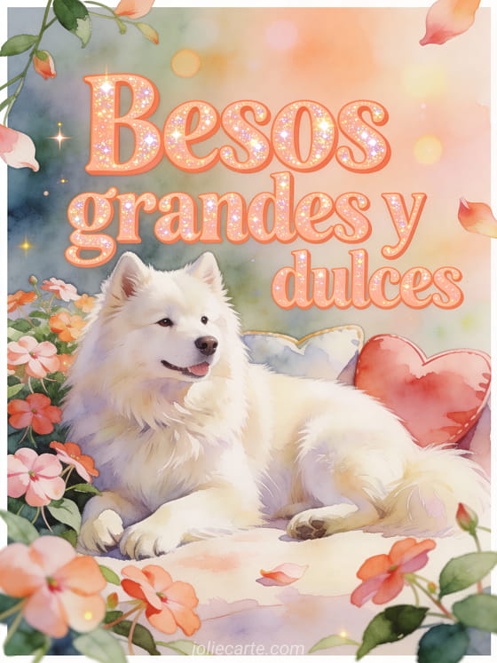 Envía besos grandes y dulces con un samoyedo esponjoso, cojines suaves y flores de impatiens en una escena alegre de acuarela. Descubre también muchos besos gato gif, una imagen llena de besos o besitos.