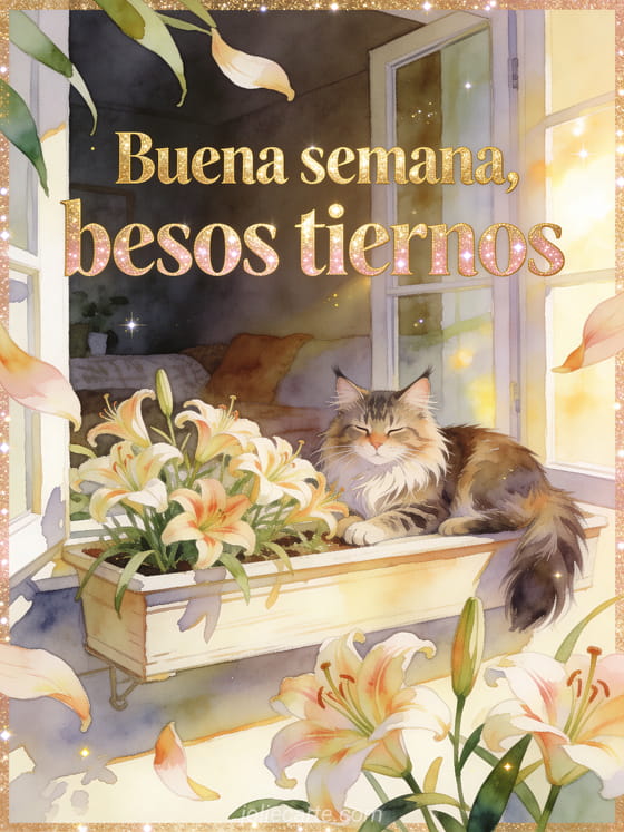 Desea una buena semana con letras oro rosa, un gato Maine Coon descansando junto a una jardinera iluminada por el sol y lirios de día en luz dorada. Descubre también una tarjeta de feliz semana a todos besos imágenes, una tarjeta de feliz semana besos gifs animados o una tarjeta de linda semana besos.
