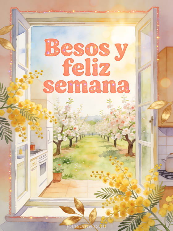 Comparte un saludo fresco de semana con letras coral, ramitas de mimosa dorada, una ventana de cocina acogedora y un huerto soleado en suave luz de acuarela. También pueden enviar besos de lunes feliz semana, muchos besos buena semana o buena semana a todos besos.
