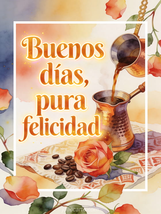 Comparte un momento rico de mañana con esta tarjeta en acuarela, con un cezve de cobre, aroma de café, una rosa abierta y granos sobre tela estampada. Descubre también buenos días buen café, buenos días café besos gif o buenos días café corazón gif.