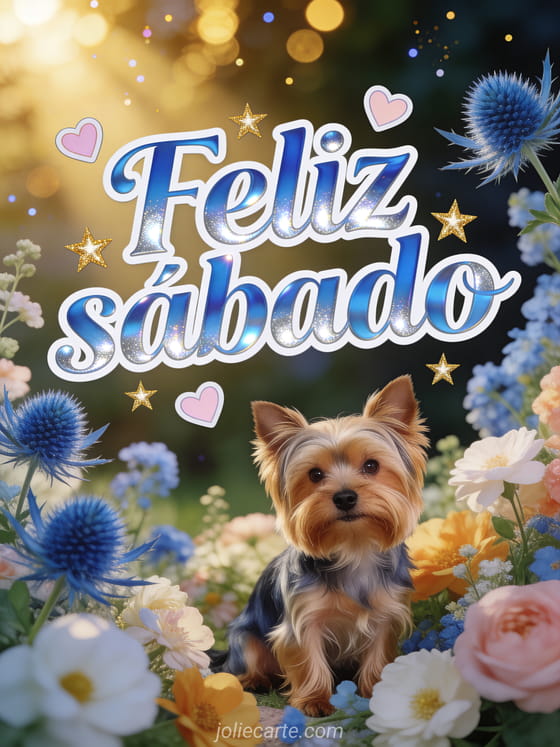 Envía una bonita imagen de feliz sábado con cardos azules, corazones pastel y una luz dorada muy cálida. Comparte un deseo delicado de fin de semana y descubre también una feliz sábado feliz fin de semana besos, una feliz sábado imagen animada o una feliz sábado mujer gif.