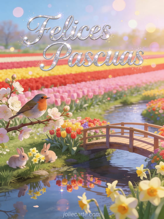 Celebra la Pascua con esta encantadora tarjeta animada gratuita con un camachuelo posado en una rama florida junto a un arroyo de Keukenhof con campos de tulipanes en rojo, rosa y amarillo, un puente de madera y conejitos entre narcisos. Descubre también carte animée paques cartes virtuelles joyeuses paques.