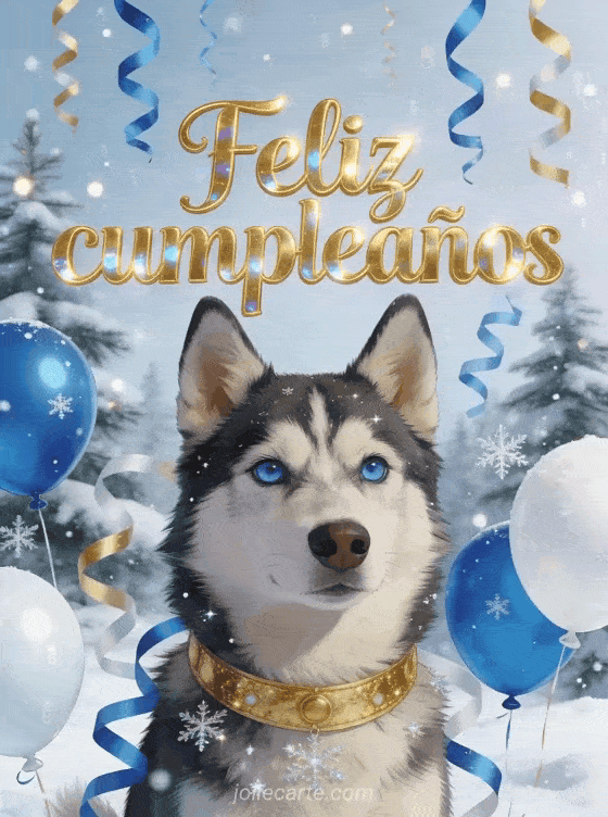 Esta bonita tarjeta de cumpleaños animada para hombres muestra un husky de ojos azules intensos con un collar de fiesta dorado, rodeado de globos azules y blancos y serpentinas contra un paisaje nevado con pinos. Una tarjeta alegre y encantadora para el cumpleaños de cualquier hombre. Descubre también una tarjeta de cumpleaños graciosa para hombre o una bonita tarjeta de cumpleaños para hombre gratis.