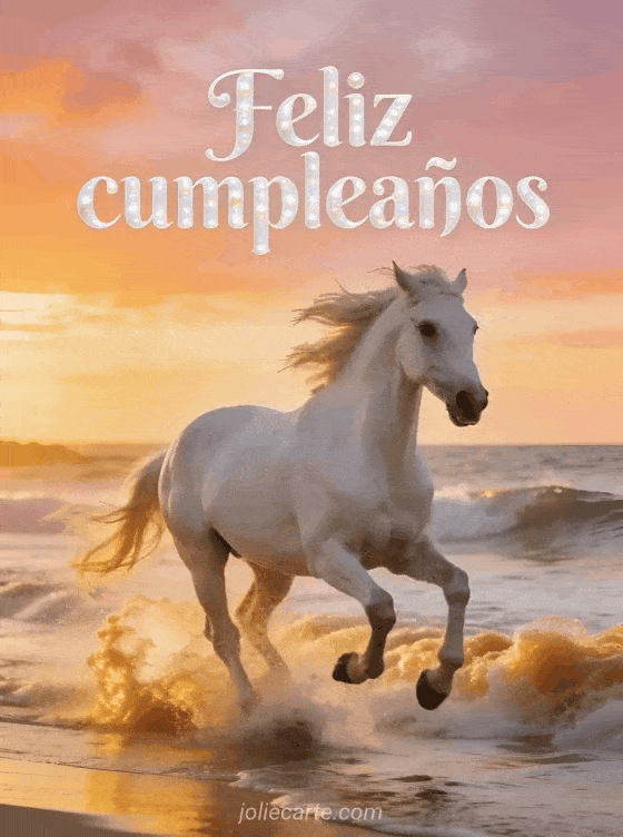 Esta impresionante tarjeta de cumpleaños para hombres muestra un magnífico caballo blanco galopando entre olas doradas en una playa al amanecer, con la crin al viento contra un cielo rosa y naranja. Una tarjeta poderosa y libre para celebrar el día especial de cualquier hombre. Descubre también una tarjeta de cumpleaños para hombre gratis o una tarjeta de humor para cumpleaños de hombre.