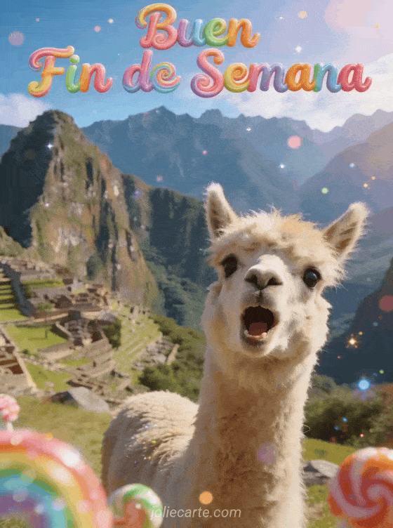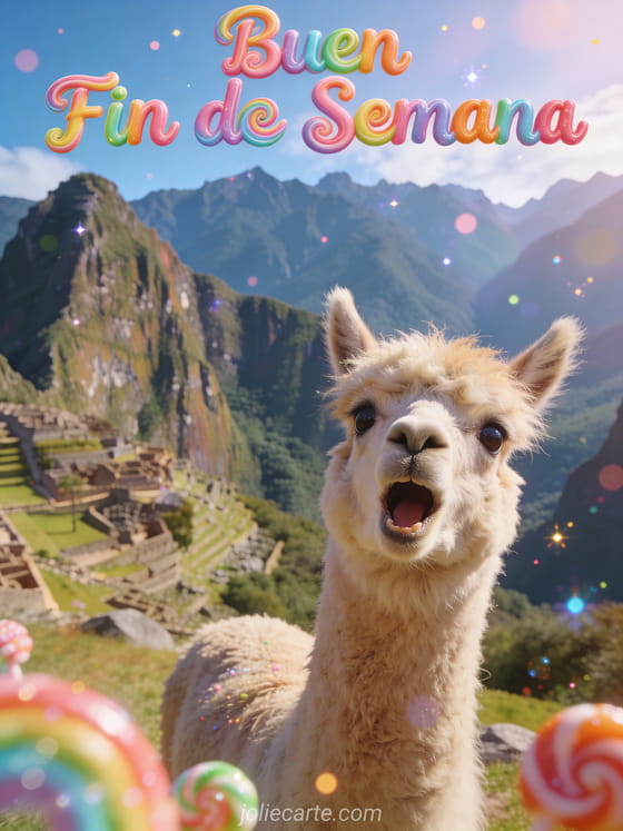 Haz reír a alguien este fin de semana con esta divertida tarjeta con una alpaca esponjosa haciendo photobomb en una escena majestuosa de montaña. Descubre también buen fin de semana gato humor o buen fin de semana gif.
