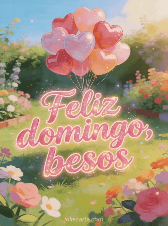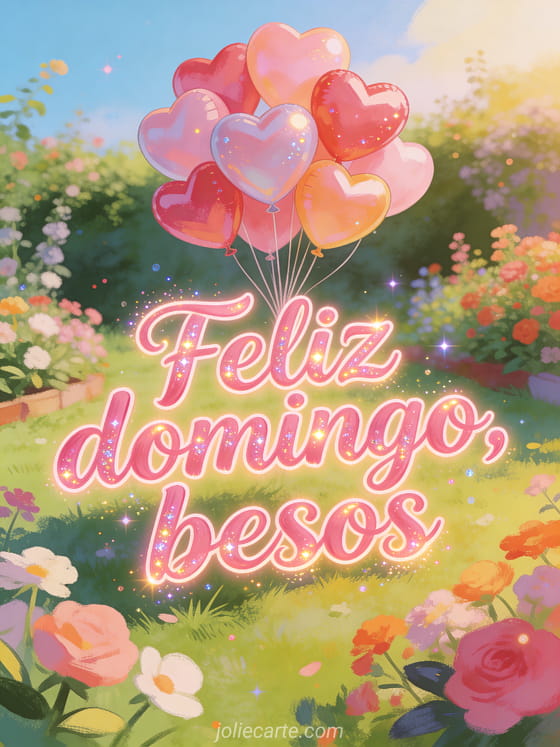 Envíen besos de feliz domingo con un grupo de globos en forma de corazón elevándose sobre jardines floridos en una paleta soleada. Descubran también tarjeta virtual hola feliz domingo, bonita tarjeta feliz domingo soleado o feliz domingo lluvioso.
