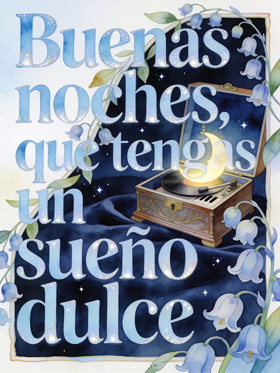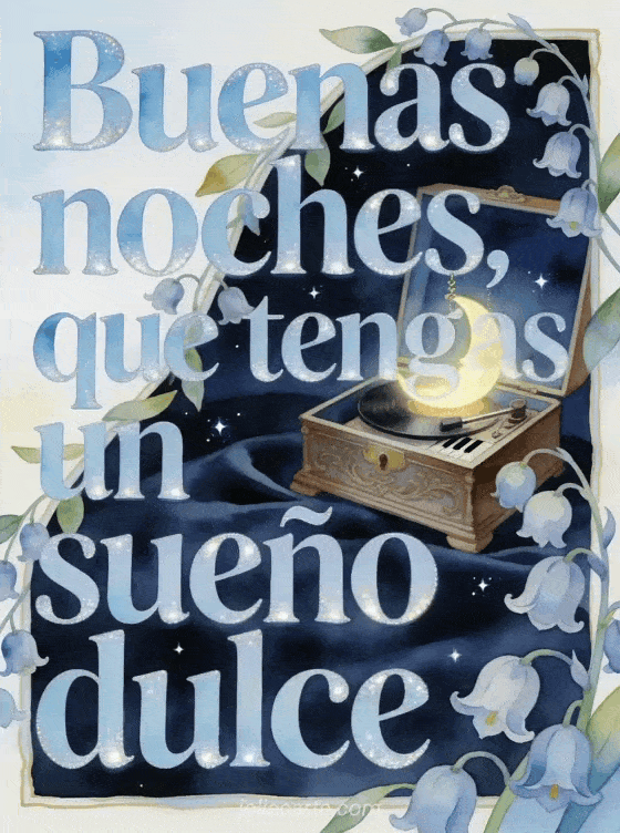 Comparte un mensaje delicado de buenas noches con letras azul pálido en acuarela, bordes brillantes, campanillas de jacinto y hojas, una caja de música antigua, un adorno de luna luminoso, cielo nocturno aterciopelado y estrellas pequeñas. También pueden enviar un mensaje para decir buenas noches, un mensaje de buenas noches para amiga o un pequeño mensaje de buenas noches.