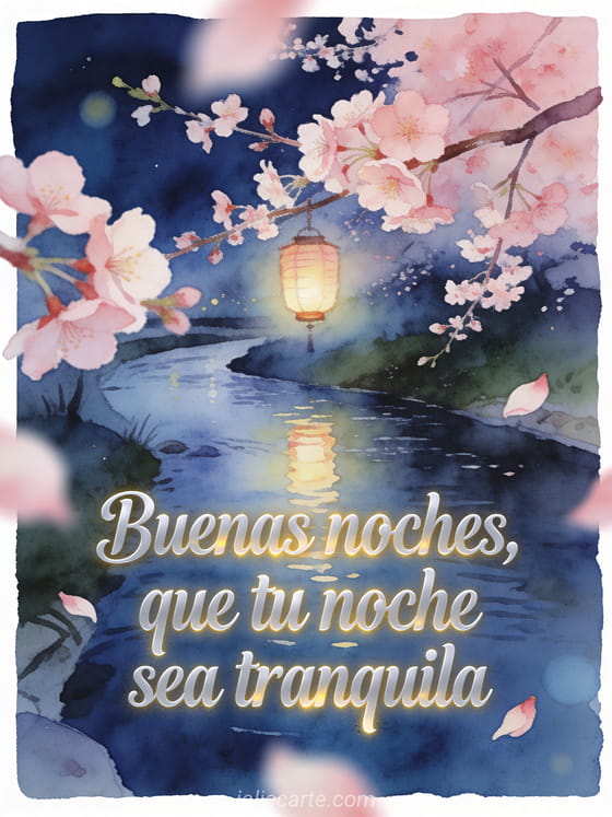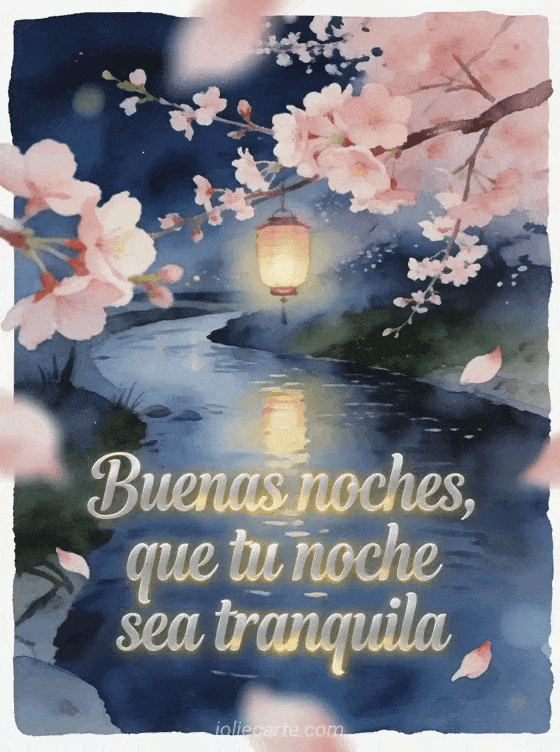 Envía un mensaje apacible de buenas noches con un río lento, luz de linternas colgantes y flores de cerezo en primer plano. Descubre también mensaje de buenas noches para su hombre, mensaje dulce de buenas noches o mensaje de buenas noches para su novia.