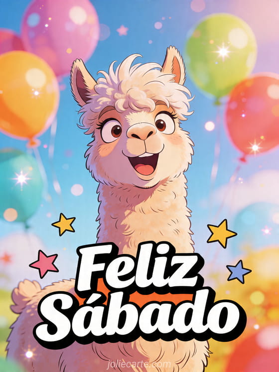 Comparte esta divertida tarjeta de feliz sábado con una llama graciosa, melena esponjosa, globos y energía de dibujo animado. También pueden descubrir feliz sábado soleado gif, feliz sábado por la noche humor y feliz sábado gif.