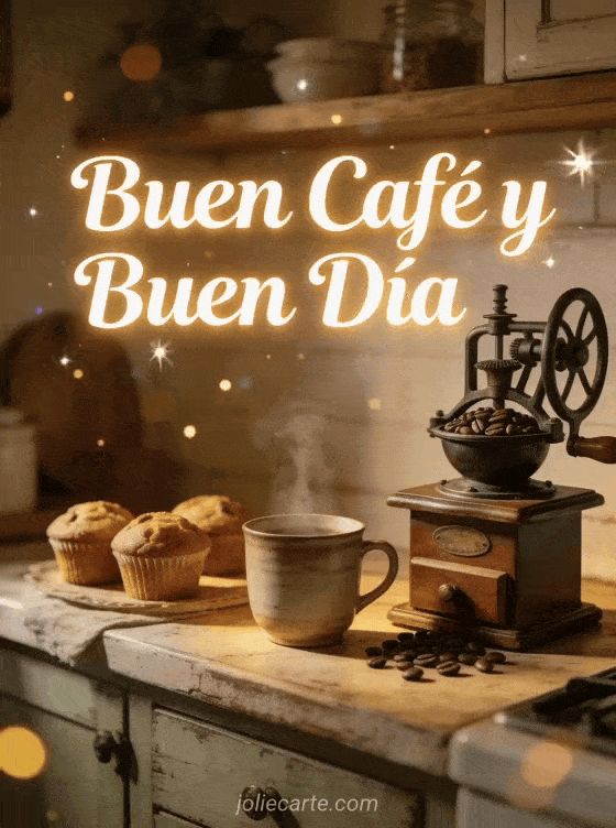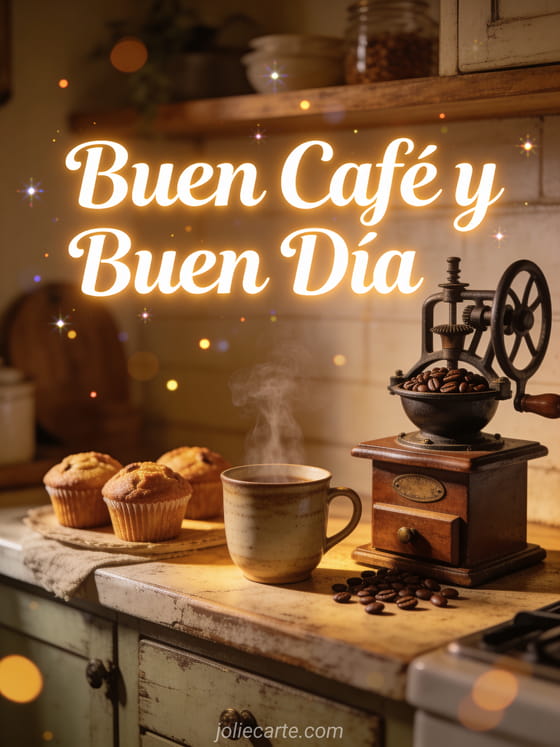 Comparte calidez matutina con esta tarjeta de buen café y buen día con un molinillo de café vintage, una taza humeante y muffins recién horneados. Descubre también una tarjeta de buen día buenos días familia imagen o de buen día conejo.