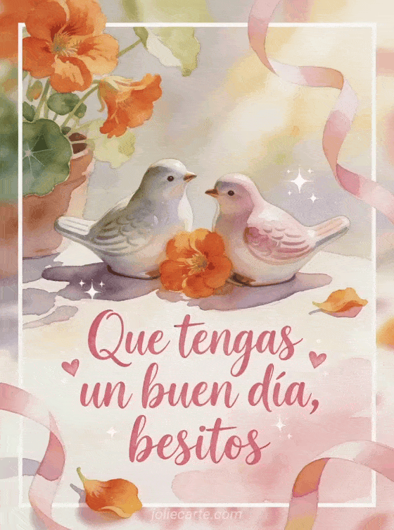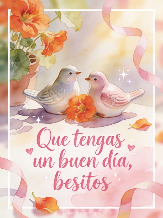 Comparte una dulce naturaleza muerta en acuarela con dos pajaritos de cerámica, capuchinas, cintas rizadas, pequeños destellos de corazón y luz cálida de mañana. También puede gustarte que tengas un buen día mariposa gif, buen día café gif o buen día gato gif.