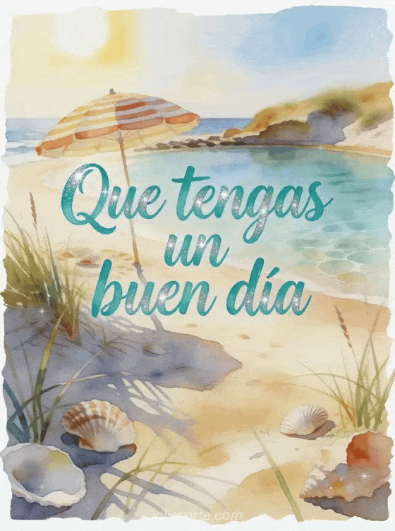 Envía un saludo relajado de buen día con una cala soleada, una sombrilla rayada, conchas y agua clara. Descubre también que tengas un buen día sol gifs, buen día soleado gifs o buen día gif zen.