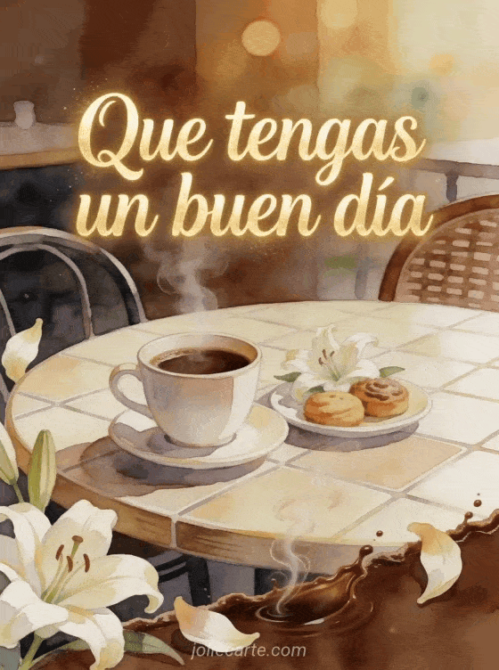 Comparte un mensaje acogedor de buen día con una taza de café humeante, pasteles y lirios de día sobre una mesa de café. También puedes enviar un buen día gato gif, buen día gifs o un buen día lluvioso gif.