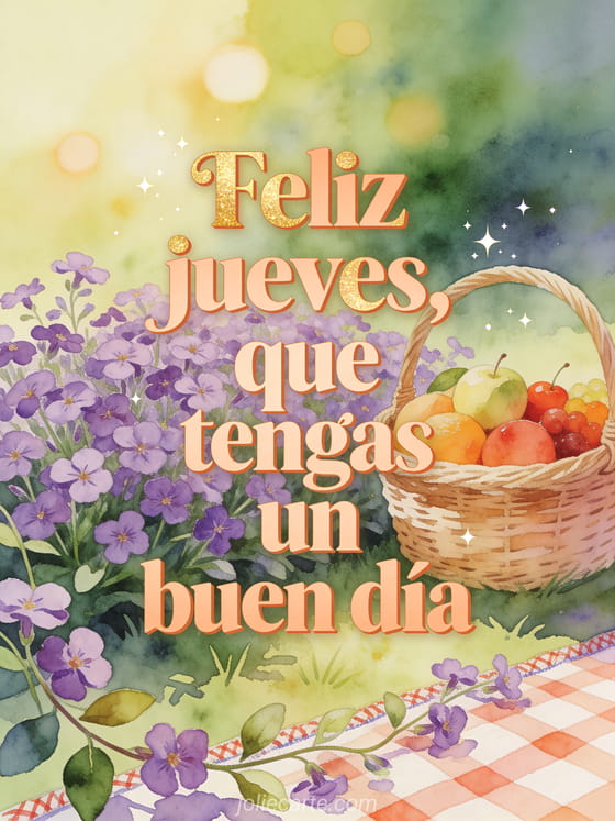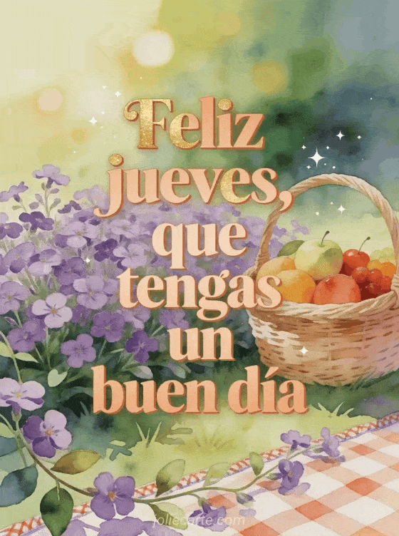 Comparte un buen día de jueves con letras albaricoque, una canasta de picnic llena de fruta brillante, aubrieta morada y tela a cuadros. Descubre también un feliz jueves foto gif, feliz jueves lluvia o feliz jueves imágenes de flores.