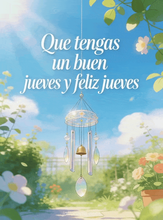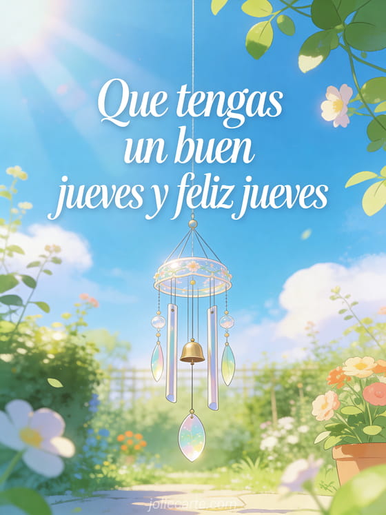 Comparte un buen día de jueves con letras elegantes y un carillón de viento en un jardín bajo cielo azul. También pueden enviar feliz jueves besos gifs animados, una feliz jueves tarjeta bonita o un feliz jueves gif para alegrar el día.