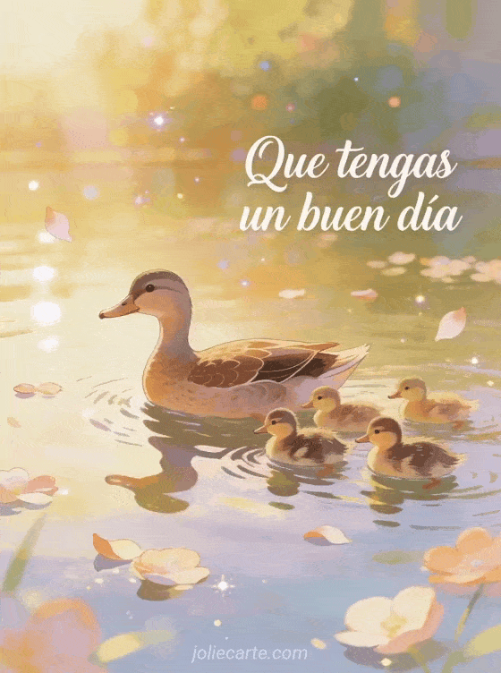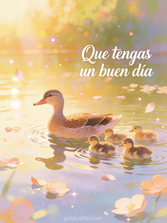 Comparte buen día de jueves con una mamá pato guiando a sus patitos por un estanque iluminado por el sol con pétalos de flores flotando. Envía más buenos deseos con buenos días es jueves en imagen, feliz jueves besos imagen o feliz jueves que tengas un buen día.