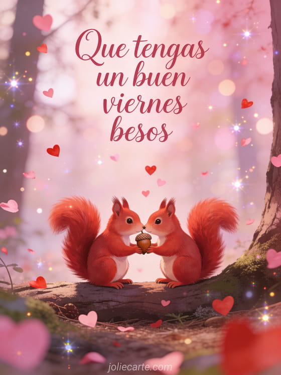 Envíen un dulce saludo de buen viernes con besos, letras románticas suaves, confeti de corazones y dos ardillas rojas compartiendo una bellota en una escena de amor del bosque. Descubran también buenos días viernes imagen, buenos días de viernes humor o feliz viernes por la mañana café.