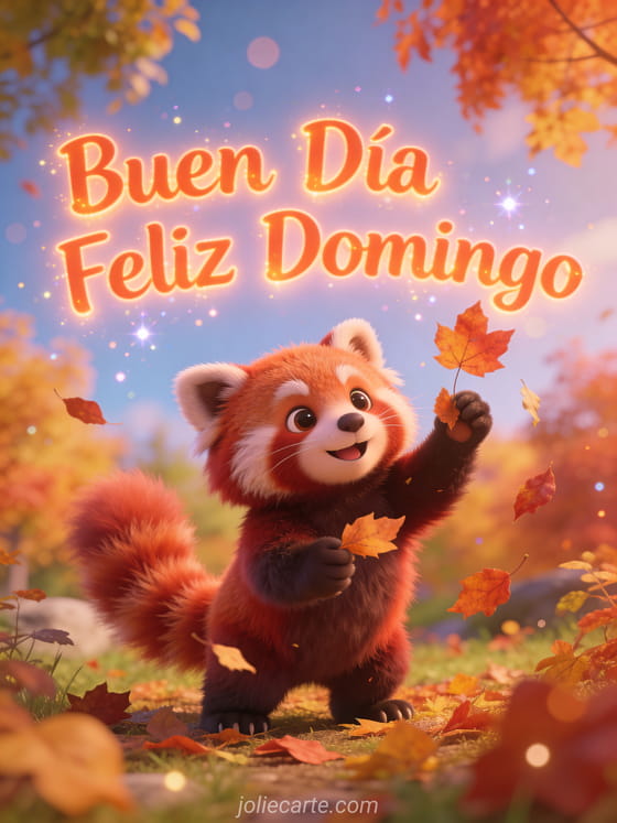 Envía un alegre saludo de domingo con un adorable panda rojo jugando con hojas otoñales en un colorido paisaje. Una forma divertida de desear un maravilloso domingo. Descubre también una tarjeta mágica de domingo o una tarjeta domingo soleado.