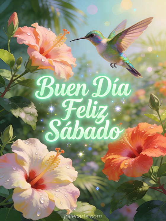 Envía un alegre saludo de sábado con un hermoso colibrí volando junto a flores de hibisco en un jardín tropical. Una forma vibrante de desear un maravilloso sábado. Descubre también una tarjeta alegre de sábado o una tarjeta de sábado con humor.