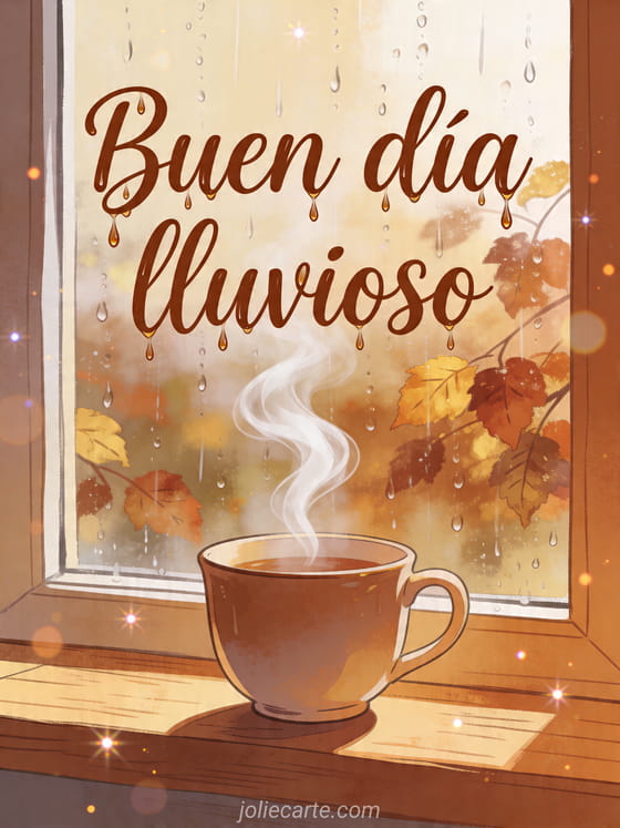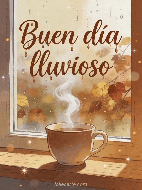 Lleva calidez a un día lluvioso con esta tarjeta acogedora que muestra una taza de té humeante junto a una ventana cubierta de gotas y hojas otoñales afuera. También pueden descubrir besitos gif buen día besitos te amo, besos lindo día gif o muchos besos buen día.