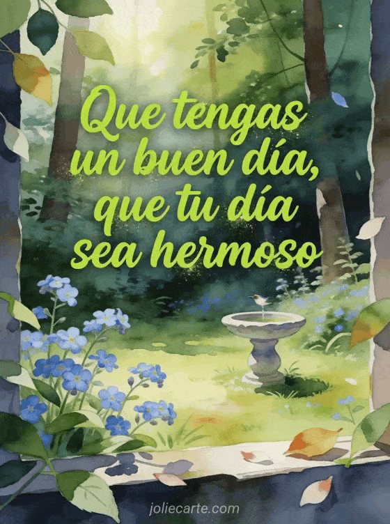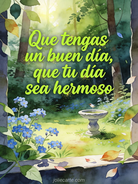 Desea un día hermoso con una tarjeta de acuarela de un claro de bosque, flores nomeolvides, hojas frescas y un pequeño baño de aves de piedra. Descubre también una tarjeta de gifs de buenos días y que tengas un buen día, buen día besitos gif o que tengas un buen día mariposa gif.