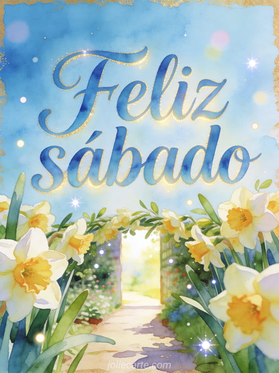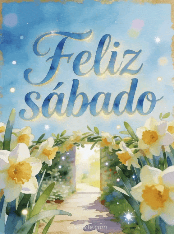 Envía una imagen de buen día sábado con letras celestes, narcisos y un sendero de jardín iluminado. También puedes compartir imágenes gif feliz sábado, una tarjeta de buen día y feliz sábado o feliz sábado café besos.