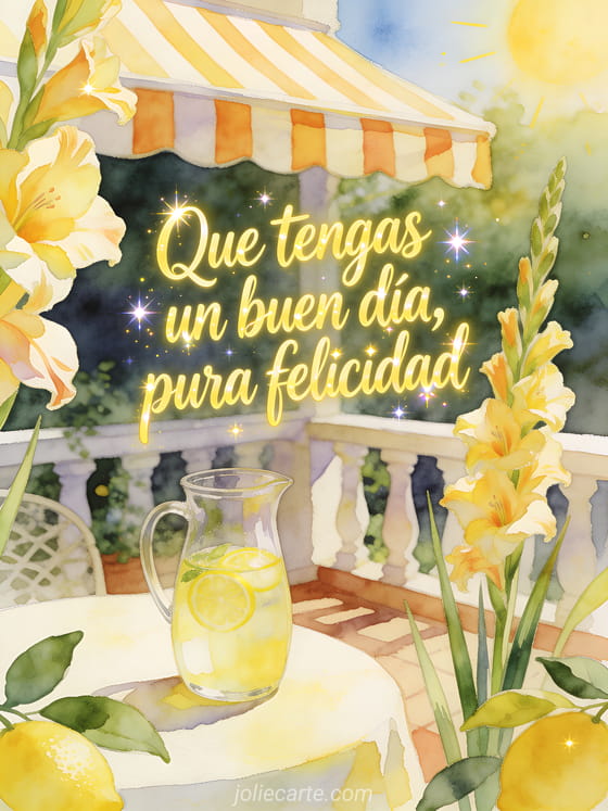 Desea un buen día lleno de felicidad con una terraza luminosa en acuarela, un toldo a rayas, una jarra de limonada, gladiolos y calor soleado de primavera-verano. Descubre también una tarjeta de buenos días buen día imágenes bonitas, buenos días lindo día besos gif o buen día naturaleza gif.