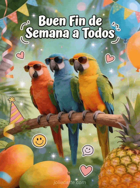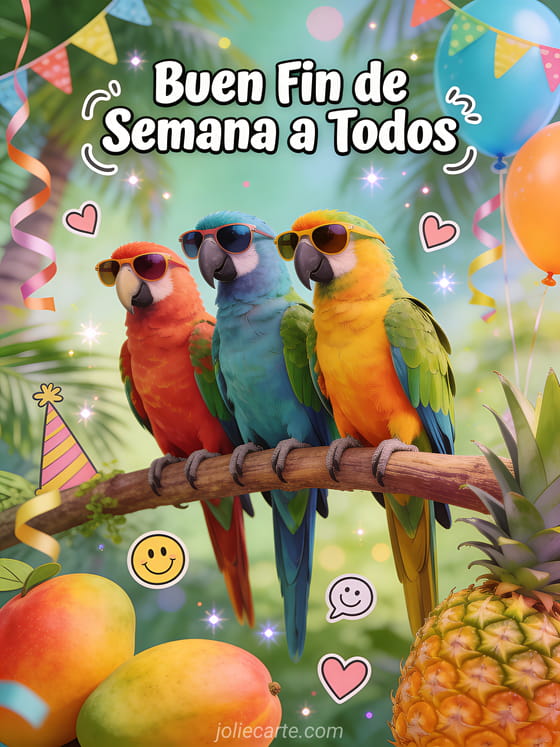 Buen fin de semana a todos humor un gracioso y colorido saludo de fin de semana para todos con loros tropicales de fiesta