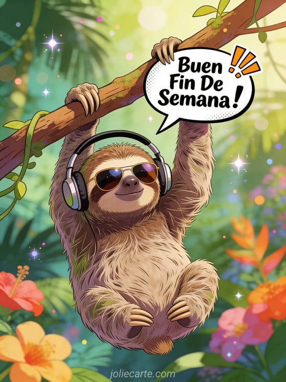 Desea un genial fin de semana con humor con este perezoso relajado en la jungla tropical. Descubre también una tarjeta que tengas un buen fin de semana o una tarjeta pasa un buen fin de semana.