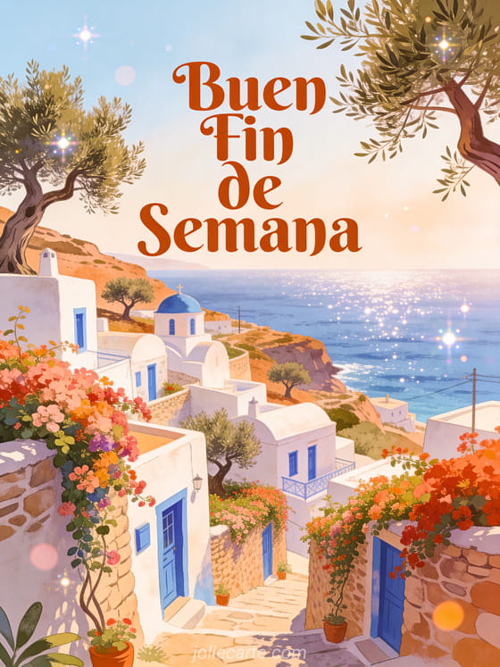 Envía una tarjeta de buen fin de semana con aroma mediterráneo. Edificios blancos y azules, buganvillas, olivos y el brillante mar Egeo crean el deseo perfecto de evasión. Descubre también una tarjeta buen fin de semana a todos humor o un humor buen fin de semana.