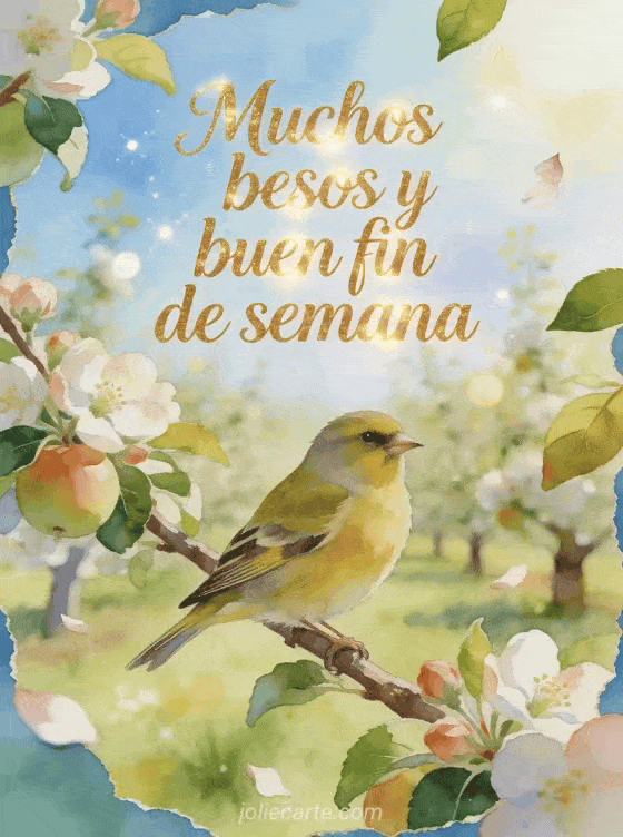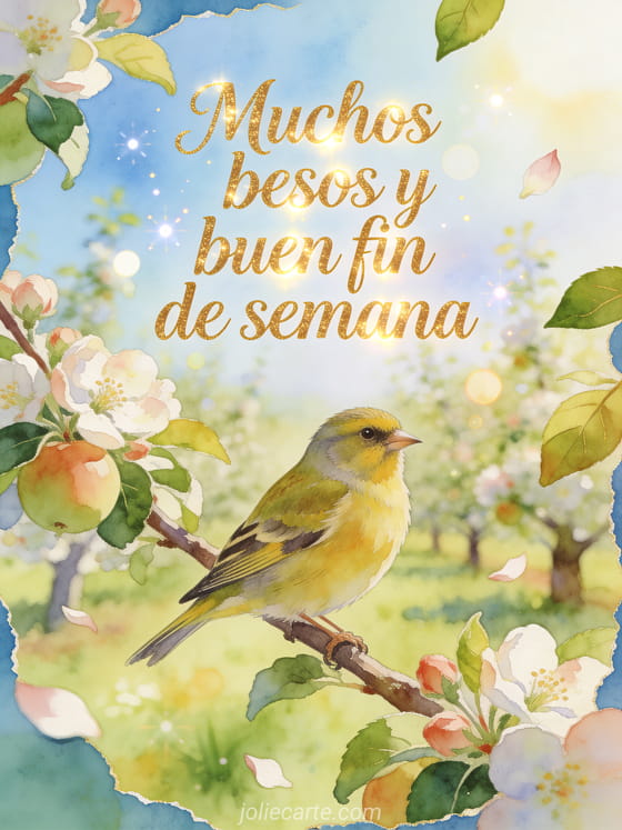 Comparte una dulzura ligera de fin de semana con esta tarjeta en acuarela, con un serín europeo posado en un huerto luminoso entre flores, pétalos y hojas frescas. Descubre también besos buen fin de semana, muchos besos buen fin de semana o buen fin de semana animado besos.