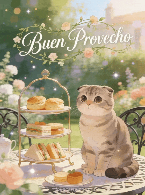 Buen provecho un encantador gif para desear a alguien una comida deliciosa con el encanto de una merienda
