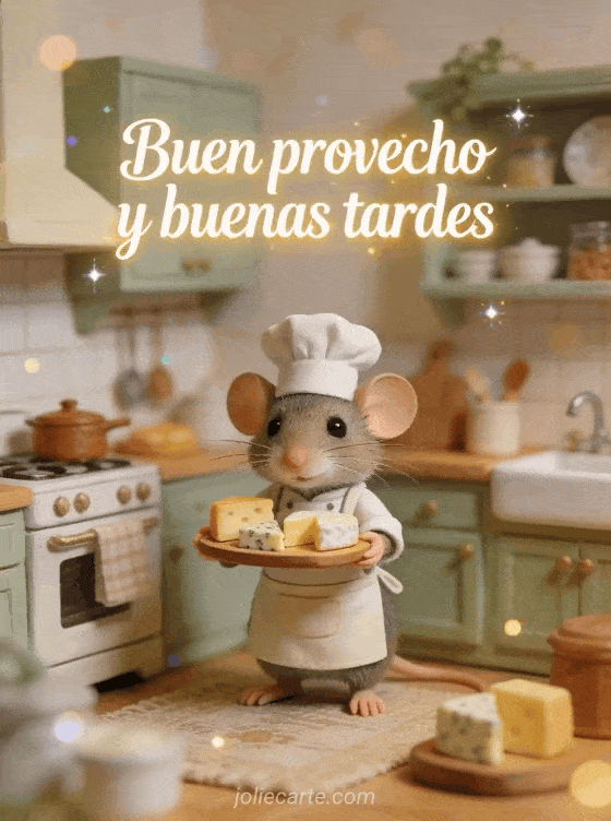 Comparte un deseo de buen provecho y buenas tardes con esta adorable tarjeta de ratón chef. Descubre también buenas tardes imágenes animadas o buenas tardes gif animado.