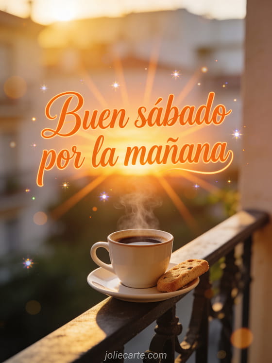 Comparte buen sábado por la mañana con un espresso humeante y biscotti sobre la baranda de un balcón, iluminados por suaves rayos del amanecer. Empieza el día con calma con sábado feliz fin de semana, sábado buen fin de semana feliz sábado o buenos días feliz sábado imágenes.