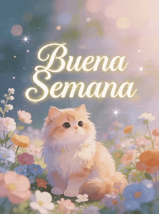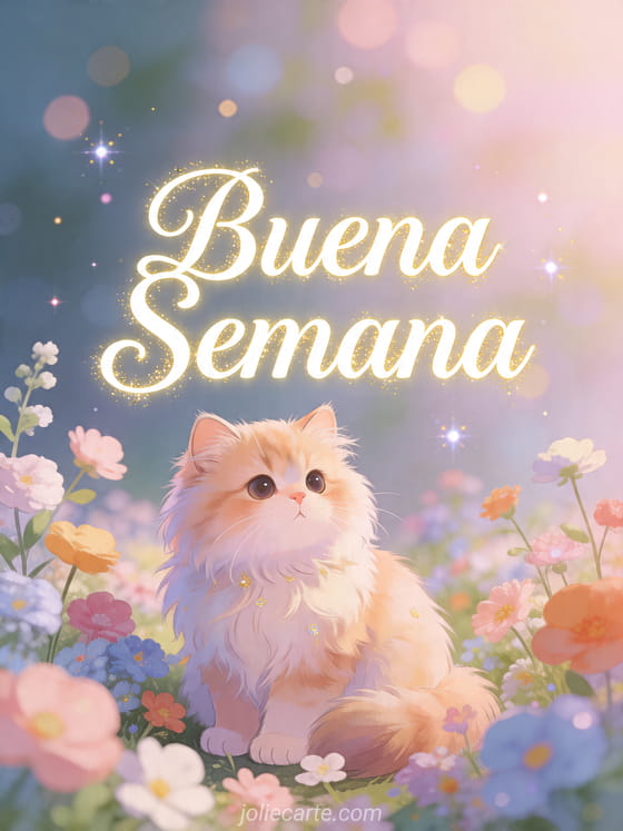 Comparte una dulce Buena semana con esta tarjeta gratis que muestra un gato persa esponjoso sentado entre flores coloridas de primavera en una escena pastel de ensueño. También puedes descubrir semana tranquila, imagen hola buena semana besos o feliz semana gifs animados.