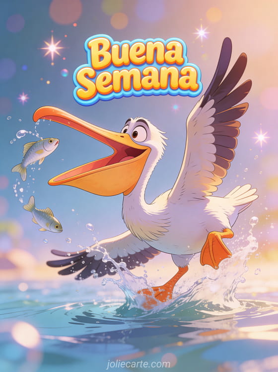 Envía una tarjeta de buena semana con humor animado y arranca una carcajada. Un pelícano torpe intentando atrapar un pez con una expresión graciosa es el deseo perfecto para una semana con humor. Descubre también una imágenes buena semana o un gif buena semana humor animado.