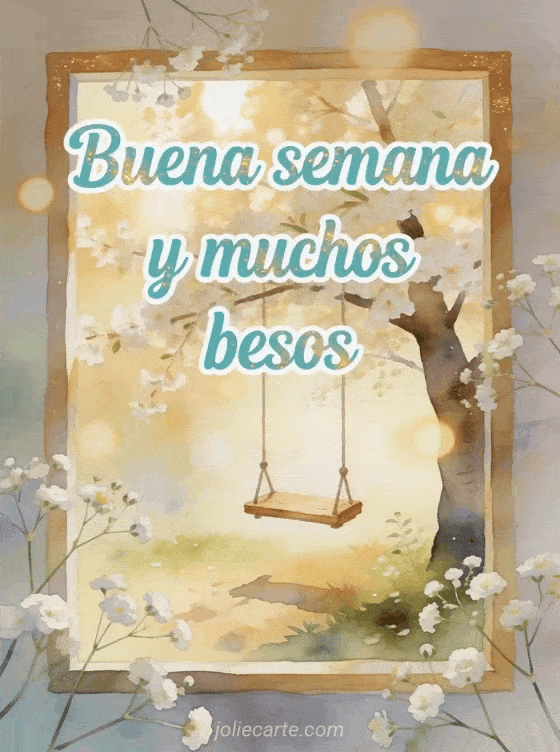 Desea una buena semana con letras turquesa redondeadas en acuarela, pequeñas flores blancas de paniculata, un columpio de madera bajo un árbol florido, luz dorada suave y bokeh aireado. Descubre también una tarjeta de semana besos, una tarjeta de besos buena semana o una tarjeta de buena semana besos gif.