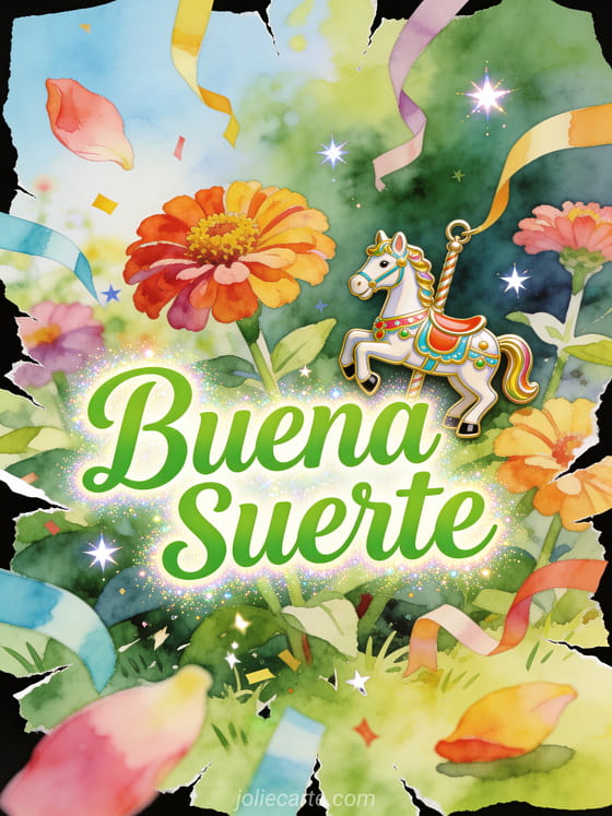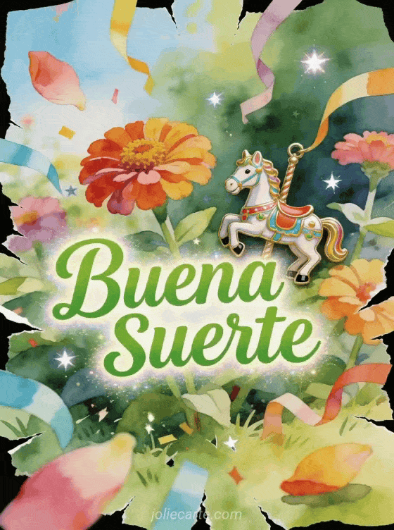 Desea buena suerte con un brillante amuleto de caballo de carrusel, flores de zinnia, serpentinas de papel y confeti de estrellas en un jardín alegre. También pueden enviar una buena suerte concurso imagen, un buena suerte en tus exámenes gif o tarjetas virtuales buena suerte.