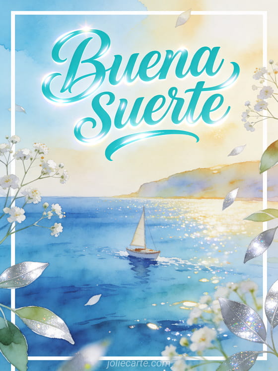 Envía buena suerte con letras turquesa, un pequeño velero cruzando una bahía azul brillante, flores de paniculata y luz dorada. Descubre también mensaje de mucha suerte para examen, buena suerte para encontrar mejores colegas que nosotros tarjeta o buena suerte gifs.