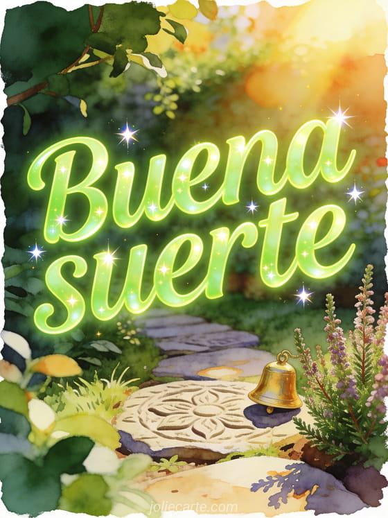 Comparte una tarjeta luminosa de buena suerte con un camino tallado de jardín, una pequeña campanilla dorada, ramitas de brezo y luz cálida del sol. También puedes enviar y luego sobre todo buena suerte gif, una imagen animada buena suerte o mucha suerte a todos imagen.