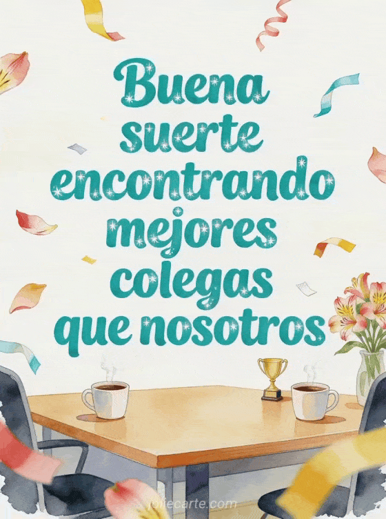 Comparte una despedida divertida con una sala de descanso luminosa, tazas de café humeantes, un pequeño trofeo, serpentinas de papel y alstroemerias. Descubre también buena suerte gifs, adiós y buena suerte tarjeta o texto para desear buena suerte.