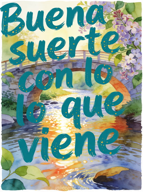 Envíen buena suerte para lo que viene imagen con letras verde azulado, un puente de piedra elegante, un arroyo brillante, flores de phlox y hojas verdes. Descubran también una buena suerte gato imagen, un buena suerte gif animado gratis o una buena suerte concurso imagen.