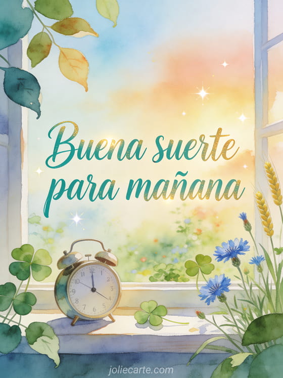 Desea buena suerte para mañana con un despertador vintage, un jardín luminoso en la ventana, tréboles de la suerte y acianos en colores cálidos de amanecer. También pueden enviar deseos de buena suerte, buena suerte imágenes gratis o texto buena suerte para lo que viene.